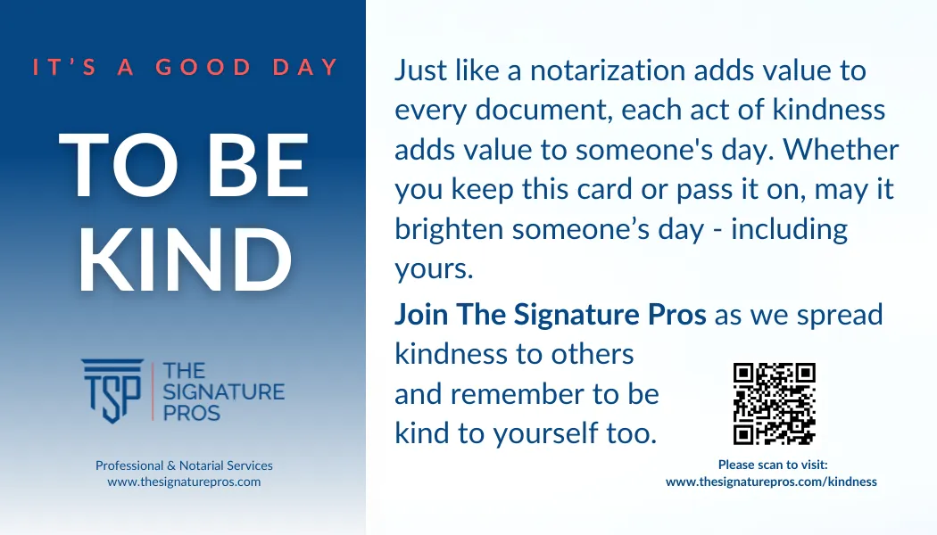 In celebration of World Kindness Day, The Signature Pros will be offering (2) free notarizations to residents of the Cameron Grove Community. This event is part of our ongoing Stamped With Kindness campaign — an initiative that reminds us that integrity, compassion, and service go hand in hand.